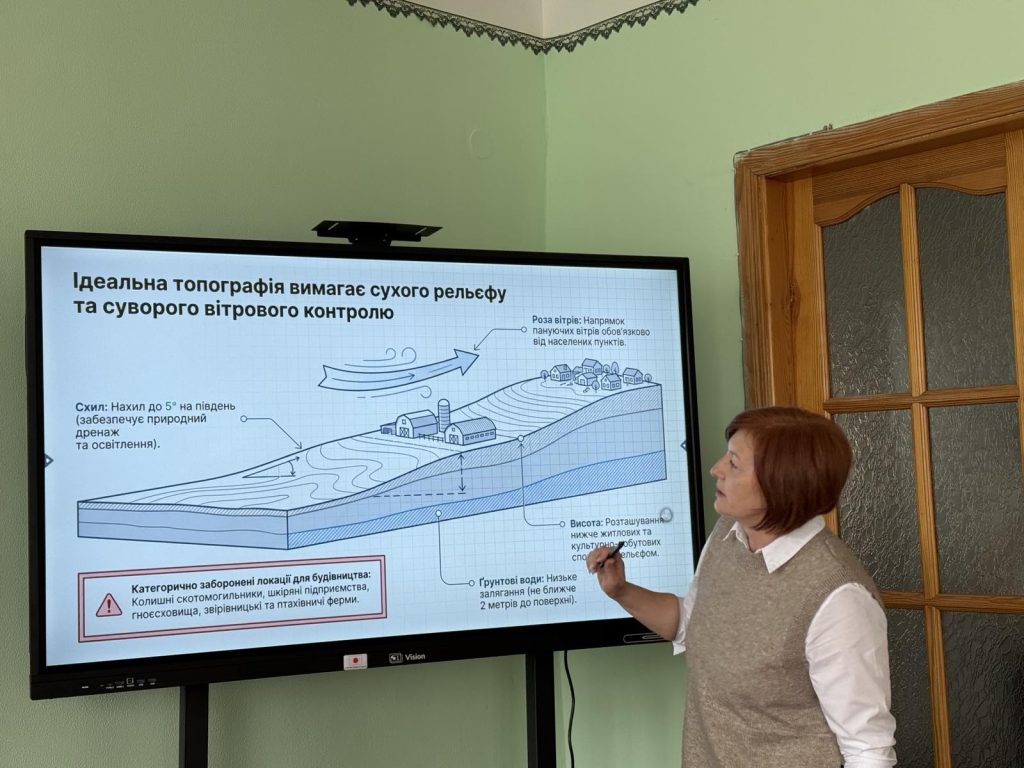 Протягом заняття здобувачі освіти розглянули вимоги до будівництва та наслідки невірного розміщення тваринницьких ферм та комплексів і якою загрозою є недотримання санітарних норм.
